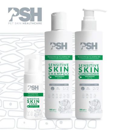 PSH – Pet Skin Healthcare – Sensitive Skin Shampoo 300ml הפורמולה שלו מחוזקת ברכיבים פעילים מרככים במיוחד כגון שמרים שעברו הידרוליזה וקומפלקס ויטמין B כדי להבטיח לחות וטיפוח העור. PSH – Pet Skin Healthcare – Sensitive Skin Conditioner 300ml הפורמולה שלו מכילה פנתנול וביוטין פעילים המקדמים התחדשות תאים, מחוזקים ברכיבים פעילים מרככים במיוחד כמו שמרים שעברו הידרוליזה וקומפלקס ויטמין B כדי להבטיח לחות וטיפוח העור. PSH – Pet Skin Healthcare – Sensitive Skin Foam 60ml קצף לכלבים וחתולים בעלי עור רגיש ושמנוני. הוראות שימוש: יש למרוח את הקצף מקומי עד לספיגה מלאה. מומלץ להשתמש בין אמבטיות, לפני ואחרי.PSH - Pet Skin Healthcare - Ozone Soft / Hard Shampoo + Sweet Conditioner 300ml + Foam 60ml זהו קו טיפולי המיועד לטיפול היגייני בעור עם דרמטיטיס, נטייה לאטופית, עם דרמטוזות דלקתיות, אלרגיות למזון ו/או ספיגה עם נגעים ראשוניים: אריתמה, פפולות, פוסטולות ו/או פלאק, כמו גם היפרקרטוזיס, אסתמה של העור, היפרפיגמנטציה ו/או סבוריאה.
